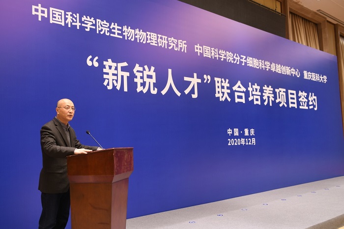 2020年12月3日, "新锐人才"联合培养项目签约仪式在重庆举行。重庆市委常委、常务副市长吴存荣,重庆市委教育工委委员、市教委副主任邓沁泉,重庆市科学技术局党委委员、副局长牟小云,重庆市卫生健康委员会党委委员、副主任李畔、重庆医科大学党委书记刘宴兵、校长黄爱龙,党委常委、副校长魏光辉,生物物理研究所所长许瑞明、教育处处长刘勤瑞、王晓群研究员、刘宁研究员,中科院分子细胞科学卓越创新中心主任刘小龙、研究生部主任马利等出席签约仪式。