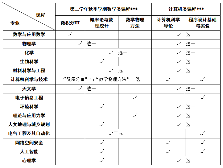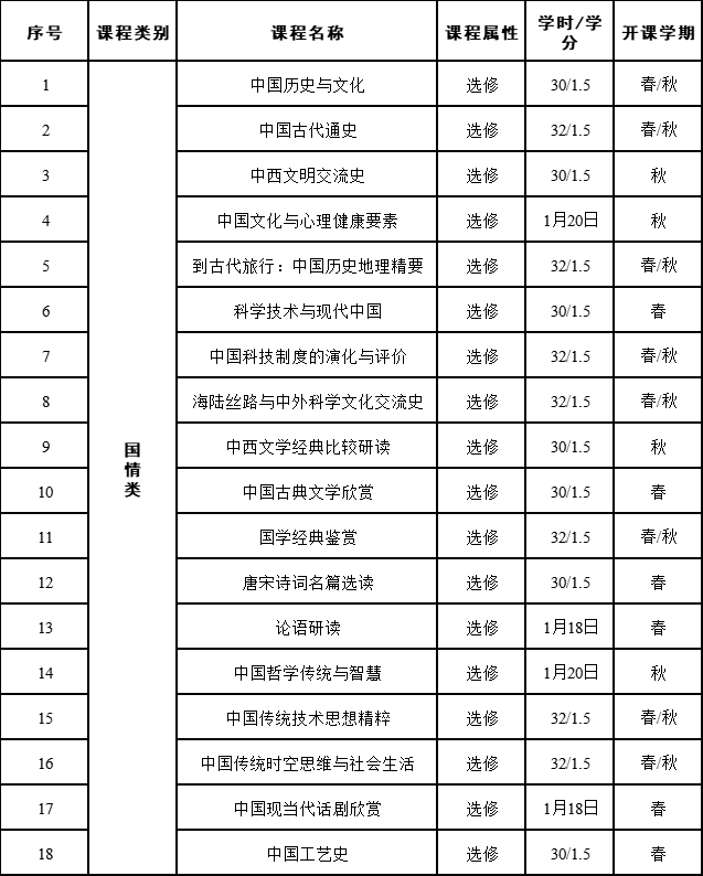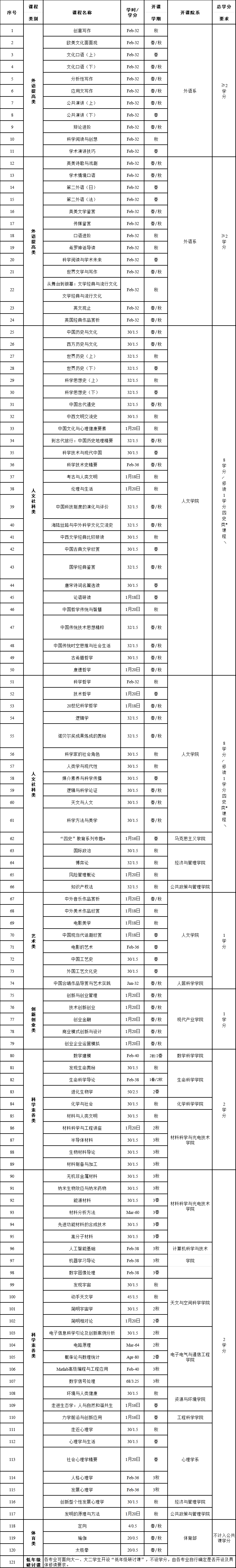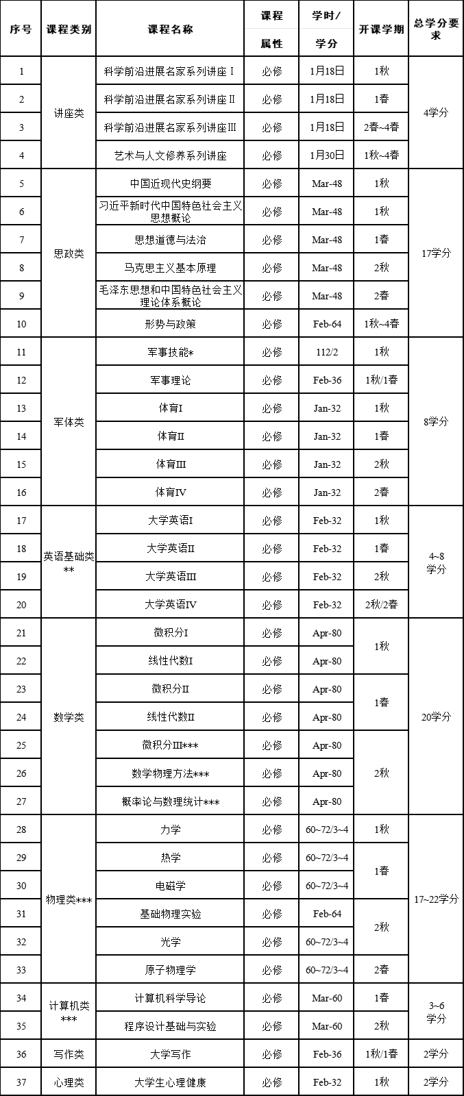 注:1.“春/秋”指春季学期和秋季学期开设,“春”指春季学期开设,“秋”指秋季学期开设。开课学期可能根据实际情况调整,以每学期开课课表为准。部分科学素养类课程开课学期采用“学年+学期”格式,学生须在对应学期修读,不可提前修读。
