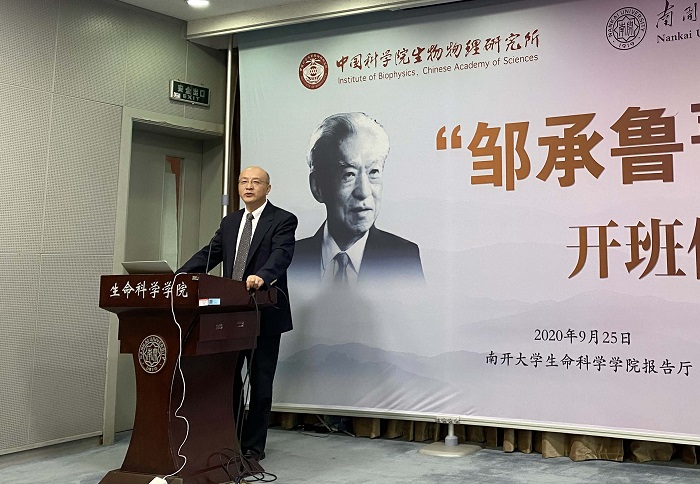 2020年9月25日,“邹承鲁菁英班”协议签署暨开班仪式在南开大学生命科学学院隆重举行。南开大学曹雪涛校长、生物物理所许瑞明所长出席相关活动。双方在致辞中一致认为:通过优势互补、携手共建“邹承鲁菁英班”,在未来5年将中科院的名师、学术前沿思想、国家级科研平台资源引入南开大学本科生培养中,实行津京两地“2.5+1.5”培养模式,科教结合提高本科生的科学素质与科研实践能力,联合培养一流科技英才。生物物理所王志珍院士亲自为“邹承鲁菁英班”上了开班第一课,她向与会师生们介绍了邹承鲁先生为我国首次人工合成胰岛素所做出的杰出贡献。通过报告邹承鲁先生艰苦卓绝的科研历程,启发现代青年学生们勤于思考、敢于质疑,以老一辈科学家为榜样,刻苦钻研、科技报国。许瑞明所长也通过与师生们分享自己从一名物理学家转变为生物学家的经历,鼓励学生们大胆探索,从失误中吸取教训,变弱点为强项,突破自我,不断拓展前行。