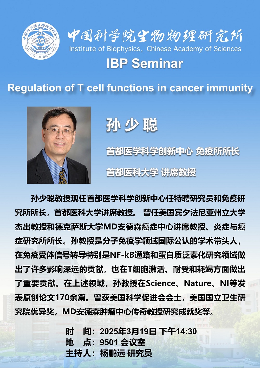 2025年3月19日下午14:30 IBP Seminar:Regulation of T cell functions in cancer immunity