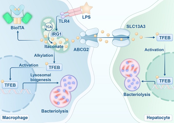 李新建研究组以往的研究表明,衣康酸能够通过烷基化修饰激活转录因子TFEB,诱导溶酶体的生物合成,进而提高巨噬细胞的抗菌天然免疫能力。已有的研究表明,髓系细胞(例如巨噬细胞)能够产生衣康酸并将其分泌至胞外,提示髓系细胞产生的衣康酸可被转运至非免疫细胞发挥功能。为了验证该假说,研究人员开发了一种可基因编码的衣康酸荧光探针(BioITA),利用 BioITA对表达靶向膜蛋白gRNA文库的细胞进行高通量筛选,发现ATP结合盒转运蛋白ABCG2和溶质载体家族蛋白SLC13A3分别是衣康酸的胞外转运蛋白和胞内转运蛋白。功能研究表明,ABCG2介导的衣康酸胞外释放限制了巨噬细胞的溶酶体生物合成和抗菌天然免疫能力;SLC13A3 介导的衣康酸摄取可提高肝脏抗菌天然免疫能力。上述研究阐明了衣康酸细胞间穿梭运输的分子机制(图2),提示衣康酸是一种具有免疫信使功能的细胞代谢物。