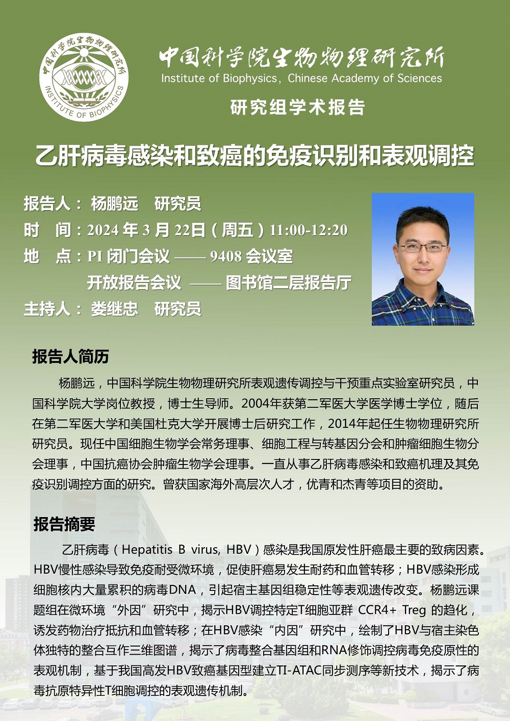 2024年3月22日中午11:00 研究组学术报告:乙肝病毒感染和致癌的免疫识别和表观调控