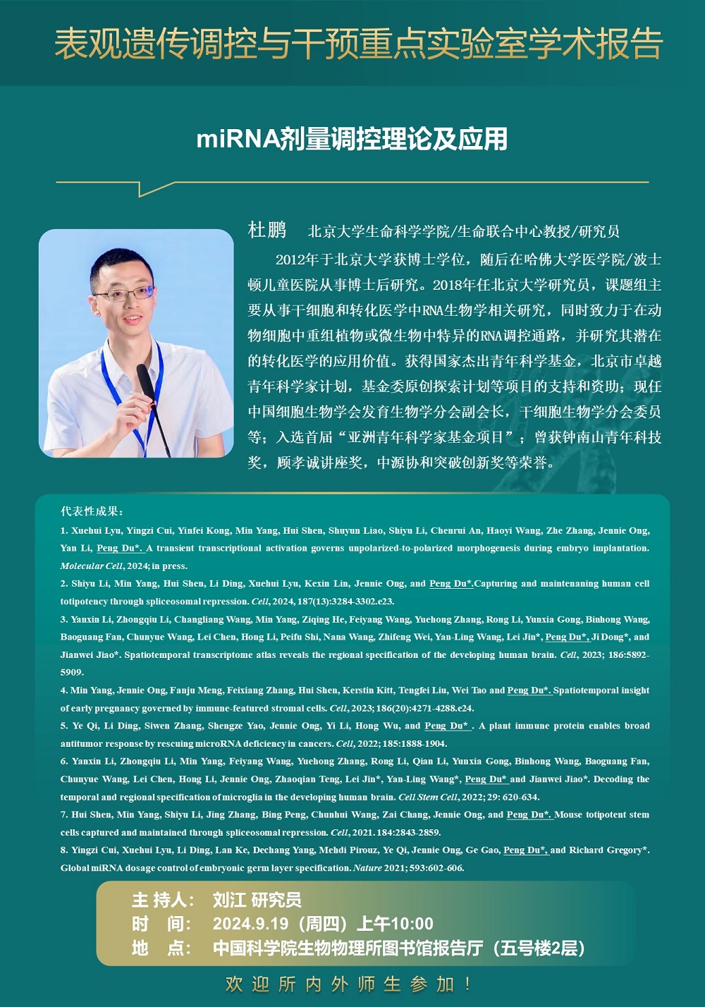 2024年9月19日上午10:00 表观遗传调控与干预重点实验室学术报告:miRNA剂量调控理论及应用