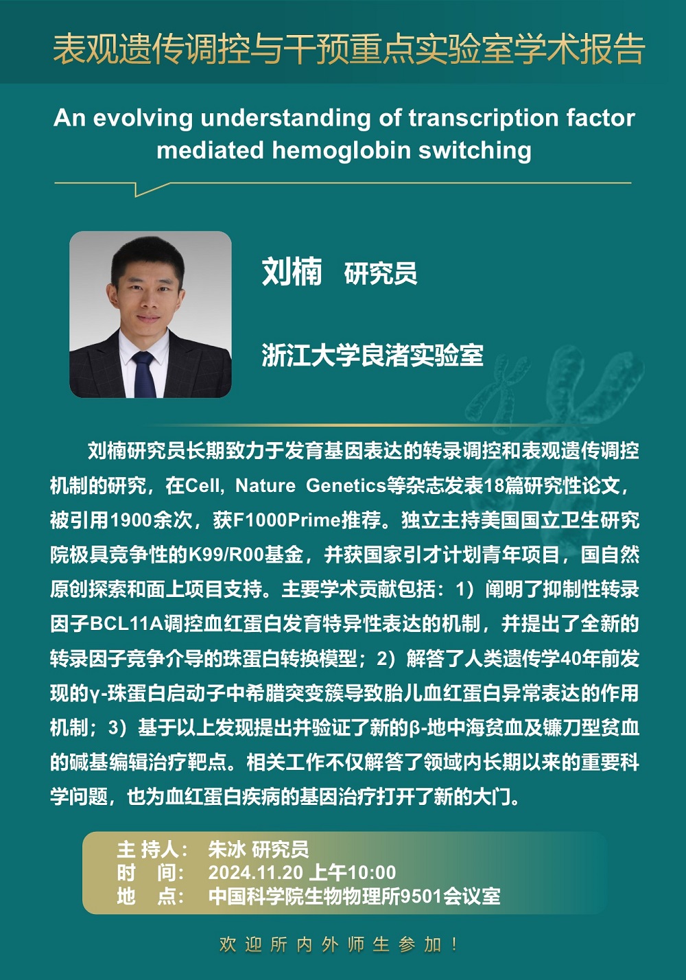 2024年11月20日上午10:00 表观遗传调控与干预重点实验室学术报告:An evolving understanding of transcription factor mediated hemoglobin switching