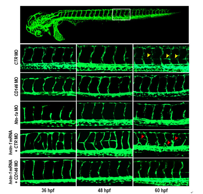 图示:在斑马鱼发育过程中,敲低netrin-1或CD146引起相似的血管发育缺陷