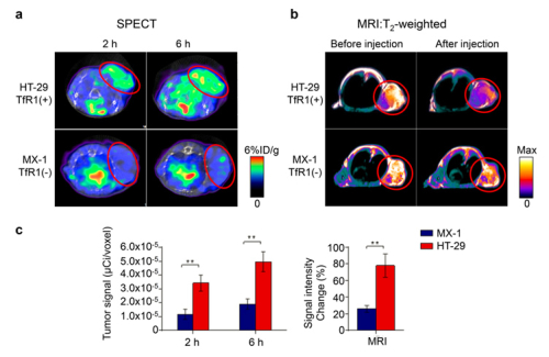 图1、纳米铁蛋白实现了体内肿瘤的核医学/磁共振双模成像。(a)肿瘤核医学成像;(b)肿瘤MRI成像;(c)定量肿瘤部位的核医学及磁共振信号。