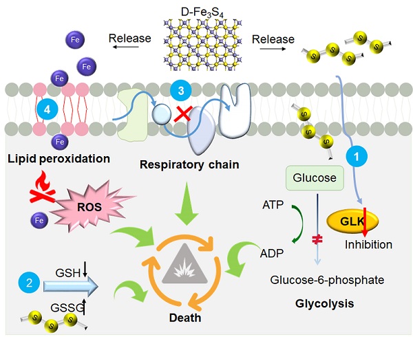 图2.亚稳态硫化铁诱导加德纳菌细菌死亡和糖酵解代谢的机制。