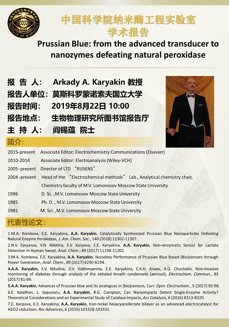 2019年8月22日学术报告:Prussian Blue from the advanced transducer to nanozymes defeating natural peroxidase