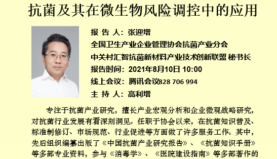 2021年8月10日,全国卫生产业企业管理协会抗菌产业分会暨中关村汇智抗菌新材料产业技术创新联盟(CIAA)秘书长张迎增应工程实验室邀请作了题为“抗菌及其在微生物风险调控中的应用”的专题报...