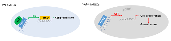 YAP在人间充质干细胞中扮演“年轻因子”的角色,那么它的作用机制是如何呢?因为YAP具有转录辅助激活因子的功能,所以研究人员对正常和YAP缺失的人间充质干细胞进行了转录组测序分析以及转录因子结合元件预测,并由此推断FOXD1可能是YAP的一个新型靶基因。