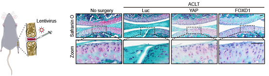 研究人员通过切断小鼠前交叉韧带建立了骨关节炎的体内模型。随后,以慢病毒载体为基因导入媒介,将编码YAP或FOXD1蛋白的慢病毒注射到患有骨关节炎的小鼠关节腔内。研究发现数周的YAP或FOXD1基因治疗均可显著降低关节软骨中衰老细胞比例,有效抑制关节软骨退化及关节腔炎症,从多个方面改善骨关节炎的病理表型。