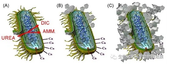 产脲酶微生物诱导生成碳酸钙沉淀的过程示意图[3]