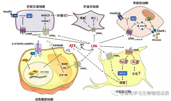 脂肪组织由前脂肪细胞、成熟脂肪细胞和少量免疫细胞组成。前脂肪细胞是成熟脂肪细胞的前体,具有增殖和分化的功能。前脂肪细胞数量的增加和单个成熟脂肪细胞体积的变大导致了脂肪组织的扩增。在肥胖过程中,脂肪组织分泌的ATX增加,ATX-LPA轴通过自分泌和旁分泌的途径,促进前脂肪细胞增殖,进一步加剧脂肪组织的扩增。另外,在肥胖过程中,ATX-LPA轴会阻碍骨骼肌细胞胰岛素信号的传递,减少骨骼肌对葡萄糖的摄取,加剧高血糖。对于肝脏,ATX-LPA轴会加速脂肪细胞中甘油三酯的分解,导致血液中游离脂肪酸的增加,间接导致了肝实质细胞对有毒脂类的吸收和累积,促进了脂肪肝的发生(详情请点击阅读原文)。