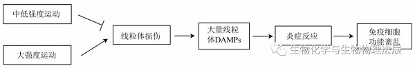 不出所料,大强度运动则主要对机体起促炎作用。研究发现,健康男性在一次性急性大强度运动后,血清游离的mtDNA水平显著升高【9】。并且大强度运动导致肌肉损伤,其释放高迁移率族蛋白B1(high-mobility group box 1 protein, HMGB1)和mtDNA,能够分别通过TLR4和TLR9来激活炎症反应【10】。这些研究表明,大强度运动导致大量骨骼肌mtDNA释放进入血液循环,进而刺激炎症反应。然而,血液中大量的DAMPs激活了免疫系统的无菌炎症,这与免疫细胞的功能障碍有关。事实上,大强度运动也导致了骨骼肌线粒体损伤【11】,并且短期高强度运动就可导致外周血白细胞线粒体功能障碍,并伴有凋亡倾向增加和促炎介质升高,这些结果支持了过度运动介导的免疫抑制作用【12】。