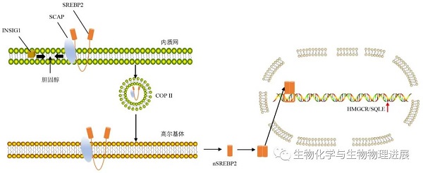 细胞内胆固醇水平占总脂质水平的5%是细胞内胆固醇合成的"分水岭"。当细胞内胆固醇水平低于5%时,SREBP分裂激活蛋白(SREBP-cleavage activating protein,SCAP)则与蛋白胰岛素诱导基因1(insulin-induced gene 1,INSIG1)分离,使SCAP-SREBP2复合物随即从内质网膜上分解并脱落【1】。脱落后的复合物经COPII转运至高尔基体活化为核SREBP2(nSREBP2)。nSREBP2以同型二聚体形式进入核内,上调HMGCR和SQLE的表达【2-3】(图1)。细胞内胆固醇合成随之增加。他汀类药物能竞争性抑制HMGCR活性,减少细胞内胆固醇生成。
