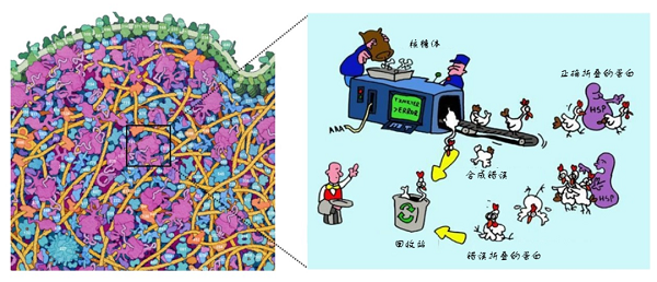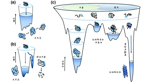 能量景观图(energy landscape)常用来描述多肽链折叠成特定空间三维结构过程中所对应的能量变化。多肽链自身所具有的热力学和动力学特性决定了其最终构象状态,因此对于特定的氨基酸序列,它所对应的能量曲面形状是一定的。就蛋白质折叠过程而言,最初由核糖体新合成的多肽链处于高自由能和高熵值的状态,非常不稳定,而蛋白质的功能态构象往往处于热力学稳定的低自由能状态,因此肽链折叠过程就是一个自由能不断降低的过程,多肽链会沿着一个“下坡路”最终到达低自由能的功能态空间结构。但是这个“下坡路”并非一路坦途,而是崎岖和充满陷阱的。在找到正确的构象之前,多肽往往会“陷入”许多不同的中间构象,形成折叠中间体。一部分中间体处于正确路径中,可以通过调整构象变化,进而跨越出“误区”,重新进入“正途”,最终折叠形成正确的结构;但另外一部分中间体则陷入高自由能的能量陷阱发生错误折叠,甚至形成错误折叠聚集体。当聚集体大量产生而无法被细胞内蛋白质质量控制系统及时清除时,就会影响细胞的正常代谢过程。某些蛋白质由于发生错误折叠,形成高度有序的富含特征性-cross-β结构的聚集体,被称为淀粉样纤维,这种结构使蛋白质分子总体处于热力学上更为稳定的状态。蛋白质的淀粉样纤维化与常见的阿尔茨海默病(Alzheimer's disease,AD)、帕金森病(Parkinson's disease,PD)、肌萎缩性脊髓侧索硬化症(Myotrophic Lateral Sclerosis,ALS)等多种神经退行性疾病多种疾病密切相关[4]。
