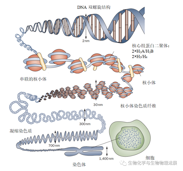 染色质作为遗传信息的载体,储存于细胞核中。对于人类细胞而言,一个细胞核中的DNA分子总长约为2 m,而细胞核的直径仅为5~10 μm。所以,必然存在一种机制把特别长的DNA分子装进肉眼不可见的细胞里。染色质由DNA、组蛋白和非组蛋白等成分组成并凝聚成一条染色体(宽约1400 nm)。浓缩的染色质(直径约700 nm)则由更细的染色质纤维(直径300 nm)和核小体(直径30 nm)组成。核小体是染色质的核心结构元件,由4种核心组蛋白H2A、H2B、H3和H4各两分子组成一个球状蛋白八聚体,周围缠绕着约147 bp的DNA(直径2 nm)。显然,这种盘绕方式不足以把2 m长的DNA塞进细胞核。于是,核小体串珠结构又被进一步折叠缠绕形成长为2~10 μm的染色单体(图1),使其可以塞进细胞核。在这个过程中,DNA分子的长度共被压缩了8000~10000倍[1-2]。