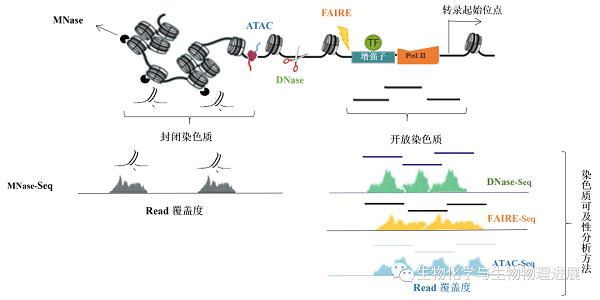 为了研究在不同的细胞生物进程中染色质的结构与其功能之间的关系,就需要对活跃的开放区域进行分析。目前研究染色质可及性的方法主要是将酶切法或物理化学方法与下一代测序技术结合,检测染色质开放或受保护的区域。常用的方法有脱氧核糖核酸酶I超敏位点测序(DNaseI hypersensitive site sequencing,DNase-seq)、微球菌核酸酶测序(micrococcal nuclease sequencing,MNase-seq)、甲醛辅助分离调控元件测序(formaldehyde-assisted isolation of regulatory elements sequencing,FAIREseq)以及转座酶可及性测序(assay for targeting accessible-chromatin with high-throughout sequencing,ATAC-seq)(图3)。