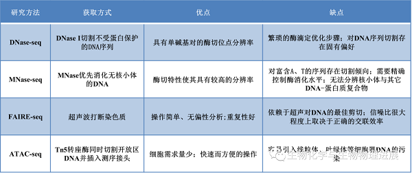 以上4种方法中,除FAIRE-seq是使用超声波物理破碎基因组DNA外,MNase-seq、DNase-seq和ATAC-seq都是基于不同的酶对DNA片段进行切割;MNase-seq直接检测与核小体结合的DNA序列,绘制出核小体占据图,从而间接反映出染色质的可及性区域,另外3种方法则直接检测染色质开放区域。每一种分析方法各有其优点和局限性(见下表)。这些方法通常反映了多个细胞的平均状态,无法分析群体细胞之间出现的差异,为了解决这一问题,科学家们开发出了单细胞scDNase-seq、scMNase-seq和scATAC-seq分析技术。在同一单细胞上同时进行多组学的联合分析在疾病研究和理解基因组功能领域上具有广阔的应用前景。