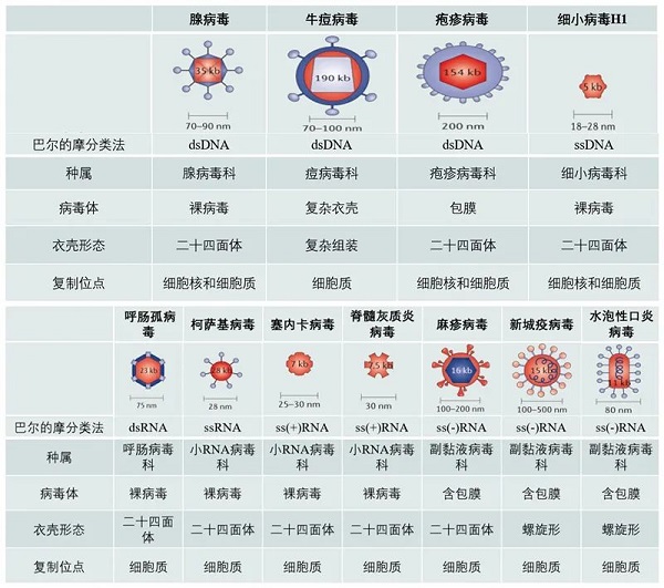 其实病毒无处不在,但它们小到无法肉眼识别,直到1940年,德国的Kausche首先利用电子显微镜观察到烟草花叶病毒的杆状外形,这也是人类第一次看到病毒。随着显微镜技术的发展,对病毒的观察逐渐深入,科学家统计发现,病毒粒子的大小普遍在20~300 nm之间[1-2]。它们的结构也很简单,遗传物质和蛋白质衣壳是最基本的结构,遗传物质也仅含有一种核酸,即DNA或者RNA。目前的研究表明,病毒的遗传物质包括双链DNA病毒(dsDNA)、单链DNA病毒(ssDNA)、单正链RNA病毒(+ssRNA)、单负链RNA病毒(-ssRNA)、双链RNA病毒(dsRNA)、逆转录病毒(图1)[3-4]。病毒不能独立生存,只能在活细胞内利用宿主的物质完成生命活动。