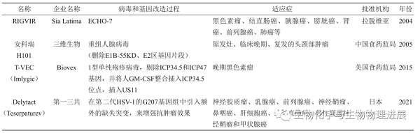 截止目前,全球已批准上市的有4款溶瘤病毒产品(表1),包括拉脱维亚Sia Latima公司治疗黑色素瘤和其他恶性肿瘤的RIGVIR,上海三维生物公司治疗鼻咽癌的安科瑞H101,美国Amgen旗下Biovex治疗黑色素瘤的T-VEC以及日本第一三共公司治疗胶质细胞瘤的Delytact(Teserpaturev)[7-9]。