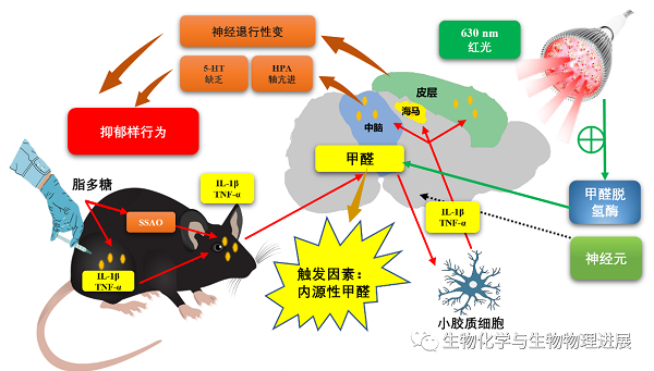 在近几十年中,炎症反应被认为是重度抑郁患者发生的关键原因。同时,外源性甲醛(FA)重复暴露会诱发小鼠出现抑郁样行为,并被认为直接触发了神经炎症。温州医科大学程建华、童志前团队首先提出了外周注射脂多糖(LPS),上调血液中的氨基脲敏感胺氧化酶(semicarbazide-sensitive amine oxidase, SSAO,一种FA生成酶),产生内源性FA并直接刺激免疫细胞释放大量的炎症因子而诱发抑郁的机制假说。(详情请点击阅读原文)