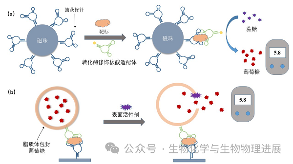 (a)酶促产生葡萄糖使便携式血糖仪响应;(b)脂质体包封葡萄糖控制葡萄糖的释放使便携式血糖仪响应。