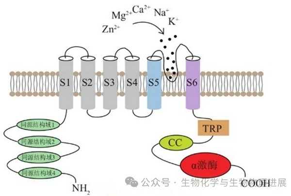 TRPM7通道是一种具有独特结构的离子通道,它由一个大型蛋白质组成,包含六个跨膜区域构成的通道结构域和一个位于C端的钙依赖性磷酸酶结构域(图1),这种结构的特殊性使得TRPM7不仅能够作为离子通道调节钙、镁等离子的流动,还能够通过磷酸酶活性参与细胞信号的调节。