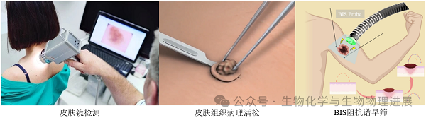 说了这么多,BIS早筛漏网之"瘤"到底靠不靠谱呢?目前临床上常用的皮肤肿瘤筛查方法有皮肤镜和皮肤组织病理活检两种。顾名思义,皮肤镜[4]是通过光学方法(如光学表皮显微镜等)来观察皮肤上的损伤或疾病,具有无创、操作简单等优势;皮肤组织病理活检则是通过切取疑似病变的皮肤组织切片后放入显微镜下观察,以判断组织的良恶或疾病的种类,是皮肤病检测领域的金标准。皮肤镜技术与BIS相比,图像显得更为复杂,一般是需要经过专业培训的皮肤科医师才能够给出准确评判。而且皮肤镜只能针对被镜头扫过的皮肤区域进行表层病变的检测。具体来说就是对于那些没有观察到的皮肤,并不能发现其是否存在异常,并且假设肿瘤发生在表皮以下的某区域,皮肤镜受限于自身探测深度,也是无法检测到的。而BIS的结果使用简单的半圆形曲线表示,极易区分,对专业知识要求大大降低,同时由于电流的软场效应,它不仅仅反映了电极接触位置的皮肤情况也能够在一定程度上包含周围一块区域的生理信息。此外,由于电流的穿透能力,更深层的皮肤病变也能够被清晰检测到[5]。