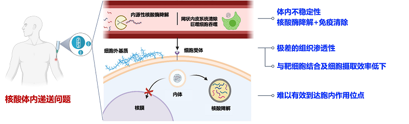 相较于传统药物,核酸药物具有治疗靶点明确、制备简单、持久高效等特点,在肿瘤及遗传病治疗中表现出显著的优越性。然而,目前核酸药物的转化应用却严重受限于其体内递送问题(图3),包括(1)核酸结构的不稳定性,易被血液和组织中的核酸酶降解;(2)外源性核酸分子具有免疫原性,在体内易引发免疫清除;(3)核酸的亲水性和负电性使其难以透过细胞膜被细胞摄取,这导致核酸药物的组织渗透性差和细胞利用率低;(4)核酸药物进入细胞后难以有效到达作用位点[10]。毋庸置疑,核酸药物的发展亟需安全高效的核酸递送系统。