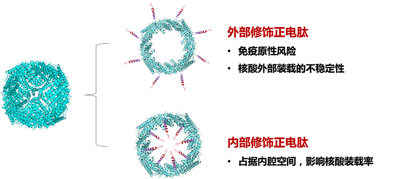 然而,铁蛋白作为核酸载体的发展也受限于其蛋白质结构的天然负电性,这使其难以有效装载同样带负电的核酸药物。通常情况下,铁蛋白内表面富含谷氨酸和天冬氨酸等酸性残基。这些酸性氨基酸的等电点为5.0~6.0。因此,铁蛋白内腔往往呈现很高的负电荷密度。目前,已有相关研究尝试通过正电改造以提高铁蛋白的核酸亲和力[14-15],但也随之带来一些问题。例如,在铁蛋白外表面进行正电修饰或融合正电肽的策略存在一些问题,包括:(1) 铁蛋白外表面性质的改变易于引发免疫原性;(2) 依赖静电作用吸附在蛋白外表面的核酸在循环系统中易被强大的血流剪切力所剥离。这会导致核酸药物的非靶标提前释放,从而引发正常组织毒性;(3)位于铁蛋白载体外表面的核酸易与血液环境中的核酸酶相互作用,使得核酸药物降解失效。至于铁蛋白内部正电改造的现有策略,虽然内部装载可以提高核酸的稳定性,但是铁蛋白内表面融合的正电肽会占据内腔空间进而降低核酸装载量(图5)。