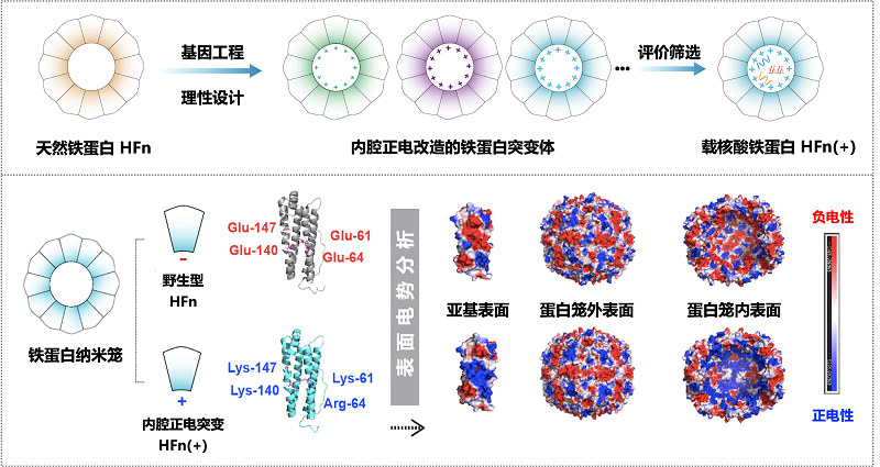 为了更好地解决铁蛋白在装载核酸药物中存在的问题,近日阎锡蕴院士团队通过对铁蛋白内表面进行点突变的方式,成功构建了具备正电内腔的铁蛋白载体HFn(+)[16]。该改造策略在不影响内腔装载空间的基础上,实现了铁蛋白内表面由"负"到"正"的转变。具体来说,研究人员基于对铁蛋白空间结构的分析,针对性地将位于铁蛋白内表面的负电氨基酸--谷氨酸(Glu, D)和/或天冬氨酸(Asp, E)突变为正电氨基酸--赖氨酸(Lys, K)和/或精氨酸(Arg, R),进而构建了一系列具有不同突变位点和数目的内腔正电铁蛋白。随后,他们对这些突变体的结构性质、自组装能力、核酸装载性能和稳定性进行了系统性评估和综合考量,从中优选了装载效率和稳定性能最佳的HFn(+) 突变体作为铁蛋白-核酸载体。蛋白质表面电势的理论分析及实验表征结果均显示,HFn(+) 铁蛋白突变体的内表面电荷性明显逆转为正电主导。更为关键的是,HFn(+) 的外表面性质相比于野生型铁蛋白却基本保持不变(图6)。这说明该改造策略可以精准地正电化铁蛋白内表面,而不干扰铁蛋白外部性质。因此,HFn(+) 突变体在提高核酸装载率的同时有效避免在体内引发免疫原性的风险。