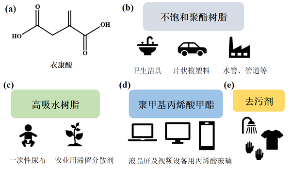 (a) 衣康酸(C5H6O4)的结构式,其含有不饱和双键,化学性质活泼。(b~e) 衣康酸是生产不同工业产品的原材料,例如可以生产尿不湿及农业用滞留分散剂;还可以用于生产手机、电脑显示屏等。另外,也能用于制造片状膜塑料、卫生洁具及管道和去污剂等。