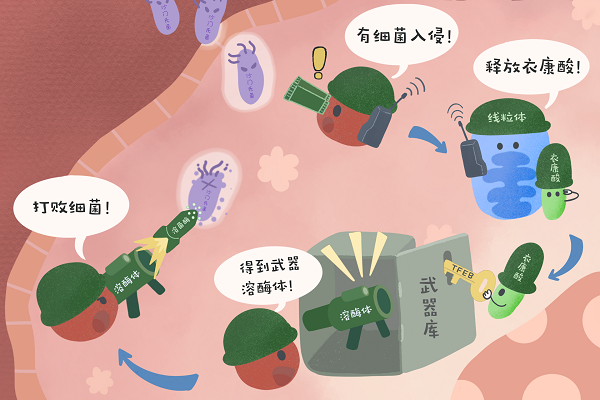 当巨噬细胞发现细菌入侵时,会立即做出响应使线粒体释放衣康酸,衣康酸通过烷基化修饰TFEB激活其入核并促进溶酶体的生物合成,进而消灭入侵的细菌。