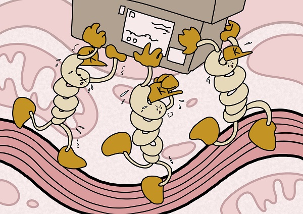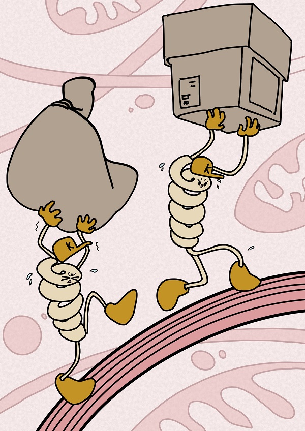 前面提到驱动蛋白有一个承接货物的接口,不同的驱动蛋白有不同的接口,从而决定了它运输货物的种类。而细胞内的这些货物常常会结合多种货物接口,这样就造成了不同驱动蛋白工作的交叉重叠。比如,至少有6种驱动蛋白与皮肤黑色素细胞中的黑色素小体转运有关。虽然工作有分工,但也少不了协作。货物很重时,多个驱动蛋白就会组成一个团队,就像旧时的纤夫一样,喊着号子、步调一致地往前走。有时候,它们还会像接力赛跑的运动员那样,将货物进行"交接",一个驱动蛋白运行了一段距离,把货物交给另一位"等待者",由后者继续传送。