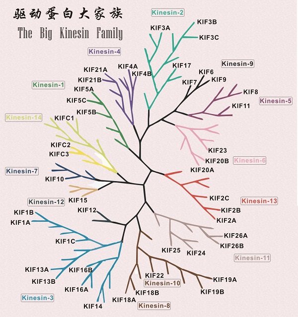 驱动蛋白有着庞大的家族,在人体内有14类共45种驱动蛋白。不仅如此,驱动蛋白还有远房亲戚--肌球蛋白和G蛋白,不过这件事着实让科学家们感到讶异。起初,科学家们并不认为它们之间会有什么联系,因为三者在个头、序列方面差异都太大了。然而在对三者的马达结构域进行了仔细分析后发现,它们马达结构域的核心部件惊人相似,动力产生的方式几乎是一样的,这才把他们归为了一族[2]。