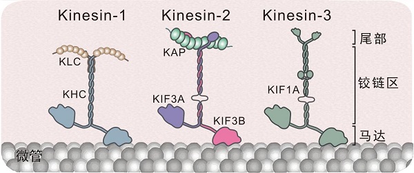 图中展示了三种有代表性的驱动蛋白:kinesin-1(由重链(KHC)和轻链(KLC)组成)、kinesin-2(由KIF3A、KIF3B和KAP组成)、kinesin-3(KIF1A)。