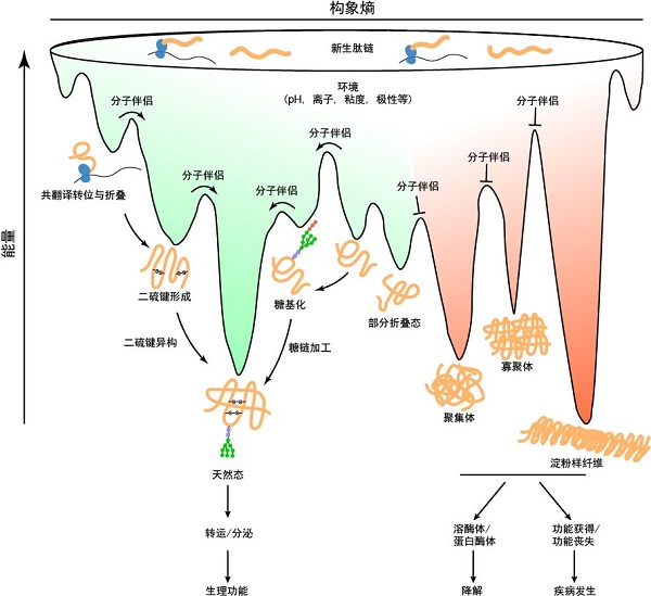 关于蛋白质折叠最早的热力学研究可以追溯到1931年,中国科学家吴宪在《Chinese Journal of Physiology》上发表了世界上第一个蛋白质变性理论[5]。二十世纪六七十年代,诺贝尔奖得主Anfinsen提出了蛋白质折叠的热力学假说[6-7]。同一时期,邹承鲁领导的小组在牛胰岛素人工全合成工作中提出的"天然胰岛素的结构是所有AB异构物中最稳定的结构之一",也蕴含着蛋白质折叠的热力学问题[8]。此外,Anfinsen和邹承鲁在实验中都发现蛋白质折叠与环境因素有关,意味着其中还有动力学问题[6-8]。沿着热力学方向,Wolynes于1995年首次系统地阐述了能量景观模型[9] (图1)。如今,人们可以测定蛋白质折叠过程中多种热力学参数的变化[10]。在动力学研究方面,人们根据实验和计算机模拟研究提出了多种现象学模型以描述折叠过程中的结构变化[11]。
