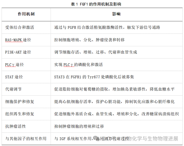 FGF1是一种多功能细胞因子,对多种生物过程具有重要影响,FGF1的作用机制涉及以下几个关键方面[3-5](表1):