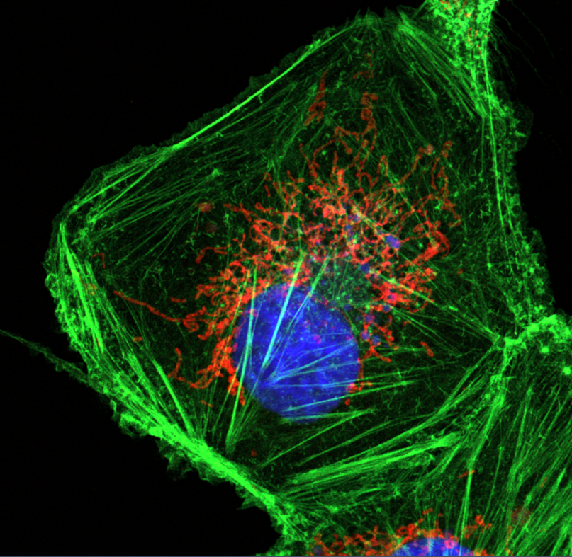 LLC-MK2 Cell Stained with Hoechst33342(blue), MT-mitotracker Red CMXRos(red) and Alexa Fluor488-Phallacidin (green) were Analysed by Confocal LSM980