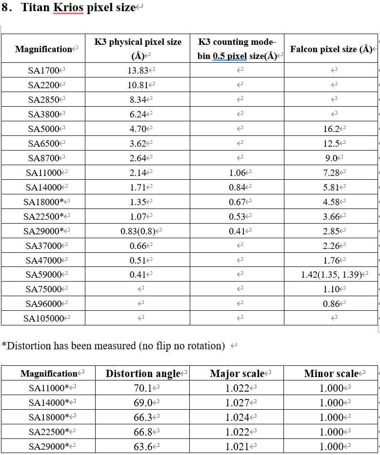 加速电压:80-300 kV连续可调;场发射电子枪;点分辨率0.27 nm;信息分辨极限0.14 nm;三级聚光镜照明系统,可实现平行光照明;低温(液氮温区)样品载物台,可倾转70度,水平可旋转90度;Autoloader自动进样系统,可一次性装载并存储12个冷冻样品;磁透镜系统具有恒功率模式;Titan Krios 1配备FalconIII和K3相机,Titan Krios G2配备FalconIII,Ceta和BioQuantum K2相机,Titan Krios G3i配备Ceta和BioQuantumK2相机
