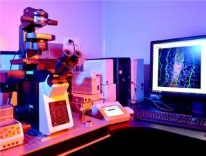 电动倒置荧光显微镜(IX83),带Z轴自动聚焦和防漂移装置;配备4个激光器(405nm 、473nm、559nm、635nm),3个荧光通道, 及1个透射光通道;具有全内反射荧光(EVA)模块