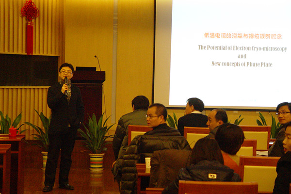 论坛共有8个学术报告。徐伟研究员首先做了题为“电子显微镜相位板技术前沿与展望”的综述性报告。报告讨论了碳膜型相位板和静电型相位板各自的优缺 点,并对新型的连续波激光相位板的发展前景作了展望。接下来何万中研究员和徐平勇研究员分别做了方法学研究报告。何万中研究员的报告题目是“新型蛋白质及 基因的电镜单分子标记及其在电子断层成像领域中的应用”,介绍了他们新开发的纳米金标记技术。徐平勇研究员的报告“荧光探针与超高分辨显微成像”介绍了超 高分辨显微成像技术的新型荧光探针标记技术,并讨论了适用于不同超高分辨显微成像技术(PALM,STORM,STED,SIM,NLSIM等)的荧光探 针制备方法。论坛的第三部分是算法研究,孙飞研究员、张法研究员和尹长城组的黄新瑞博士报告了他们在电镜算法研究中的最新成果。张法研究员做了关于大尺度 电子断层扫描的三维重构迭代算法的报告,即在曲线投影模型基础上加上迭代算法,并使用多积法,使每一轮迭代值正交,减少迭代次数。但该方法也存在未知参数 过多、计算量巨大、以及某些基于直线模型的工作无法进行等问题。黄新瑞的报告中用高斯方法作为模型,用小波滤波变换的方法摸索出一套小波滤波的参数。与常 用的几种方法比较,能够得到更好的滤波效果,尤其是对噪音大的图像。论坛的最后一部分由清华大学隋森芳组的周强博士和高宁组的冯博雅博士为大家做了冷冻电 镜三维重构在生物大分子(DegQ-24聚体和核糖体)结构研究中应用的精彩报告。
