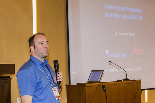 在9月23日的会议报告上,金沙集团1862cc和徕卡仪器有限公司的相关领导做开场发言,生物物理所科学研究平台韩玉刚主任发言表示:徕卡公司与科学研究平台共同组织学术活动,为平台发展和建设起到了积极作用。徕卡仪器有限公司生命科学部许英杰经理也指出:科技创新,离不开高精尖的科研仪器和实验技术。之后,投入式快速冷冻仪Leica EM GP的设计者、来自Nexperion e.U.公司的Guenter Resch博士;被誉为“超薄切片第一人”、来自Diatome公司的技术专家Helmut Gnaegi;FEI公司的技术专家Ben Lich博士、王庆博士;徕卡公司的技术专家Cveta Tomova博士、童艳丽、张艾敬作为主讲人,为大家介绍了细胞电镜冷冻制样前沿相关的高压冷冻技术、冷冻替代技术、投入式快速冷冻技术、冷冻超薄切片技术以及低温电镜数据收集和图像处理技术。生物物理所生物成像中心孙飞主任也受邀做了题为《连续切片扫描电镜成像方法在线虫大尺度三维重构中的应用研究》的报告,为大家介绍了生物成像中心在大尺度高通量连续切片扫描电镜数据收集方面的最新技术和研究成果。会议报告内容精彩纷呈,报告之后的提问环节也十分热烈。