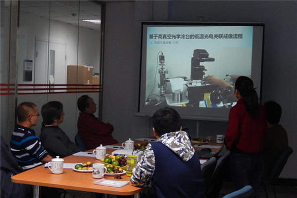 验收会上,专家组首先听取了项目负责人李硕果对该项目的实施过程、研制结果的报告,随后现场对该研制设备的各项验收技术指标,进行了细致的现场测试。经测试,项目研制目标——光电关联多尺度成像系统用冷冻样品传输装置原型机已基本完成,各项指标均已达到预期要求。测试结果显示:该系统操作便捷,一次上样可以在光镜、电镜间自由转移,避免在实验过程中再次触碰样品,减少样品损伤几率;低温样品杆自身带有冷却装置,简化了真空冷台的制冷系统,系统设计更加简单、灵活,使用方便;且该系统工作环境简单,可以有效隔离冷冻样品与光学物镜镜头之间的热传递,使该系统不必使用特殊设计物镜镜头,避免窗口结露和长时间使用的腔壁结露、结霜问题,对环境湿度要求低;同时,防污染措施有效避免了样品的在成像和样品转移过程中的污染问题;该系统还可以实现光镜-电镜图像坐标匹配,可实现多通道荧光定位功能,并导引电镜快速锁定成像目标区域。此外,该设备还可适用于不同型号的倒置荧光显微镜以及透射电子显微镜,可以实现低温光镜定位与电镜高分辨关联成像数据收集,是对现有低温成像技术的提升和扩展,大大降低了低温光电关联成像的技术门槛,提高了低温光电关联成像技术的稳定性和可靠性。