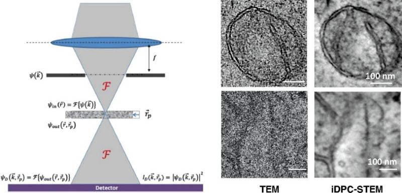图为STEM成像过程示意图和TEM、iDPC-STEM图像