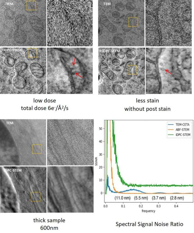 图为低剂量,减少染色和厚样品时TEM和iDPC-STEM的图像,以及TEM、ABF-STEM、iDPC-STEM信噪比对比图