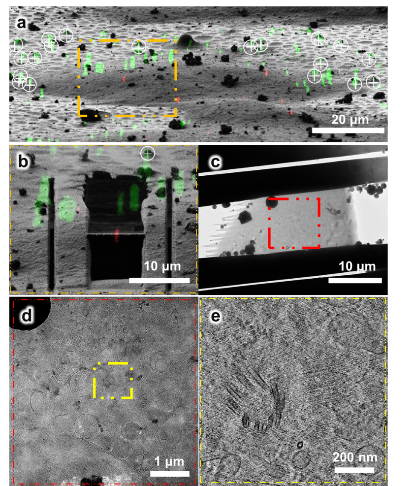 光镜-电镜关联成像技术(Correlative Light and Electron Microscopy, CLEM),是利用荧光特异标记对特定生物大分子或亚细胞结构进行荧光示踪,实现对整个细胞的三维荧光定位成像,之后通过荧光图像和电镜图像的配准,获得荧光标记信号和电镜超微结构的关联信息。冷冻光电关联成像技术的应用方向之一,是通过关联图像,指示出荧光标记的结构在电镜图像中的具体位置,实现对荧光示踪目标物的电镜高分辨率结构解析。而得益于光镜成像对生物样品的无损特性,可以在不损伤样品的前提下获得样品内部的三维荧光定位信,再通过光电关联成像流程和关联对齐软件,将三维荧光图像与扫描电镜图像关联匹配,实现在荧光信号的指导下进行cryo-FIB对目标区域的减薄加工。如此,便可以避免“盲切”,实现对荧光指示目标物的指导切割,以期提高冷冻聚焦离子束技术用于电子断层成像切片样品制备的效率。