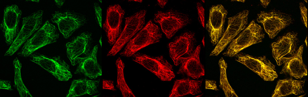 fig.细胞骨架(中间纤维) Courtesy of Yan Teng, CBI, IBP, CAS. Image Details: Imaged by confocal microscope. Introduction : 细胞骨架是由蛋白质与蛋白质搭建起的网络结构,除了维持细胞形态,在细胞内物质运输和细胞运动方面也发挥着重要的作用,细胞骨架的主要成分是微管、微丝和中间纤维,图中所示即是细胞骨架的中间纤维。