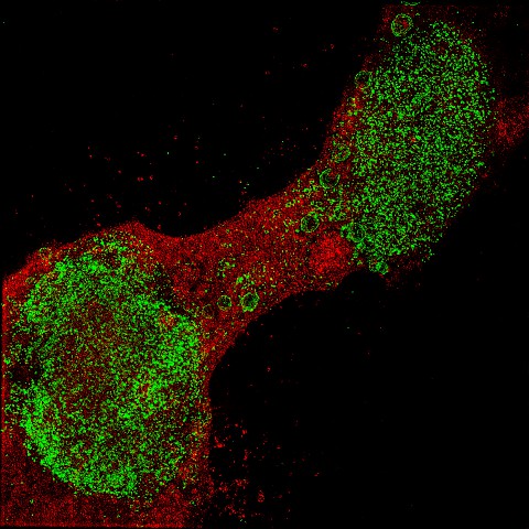 作品说明:在观察带病毒基因组的BAC转染的细胞中两个病毒蛋白的定位,发现两个细胞连在一起,中间还有一些泡状物,藕断丝连难舍难分。
